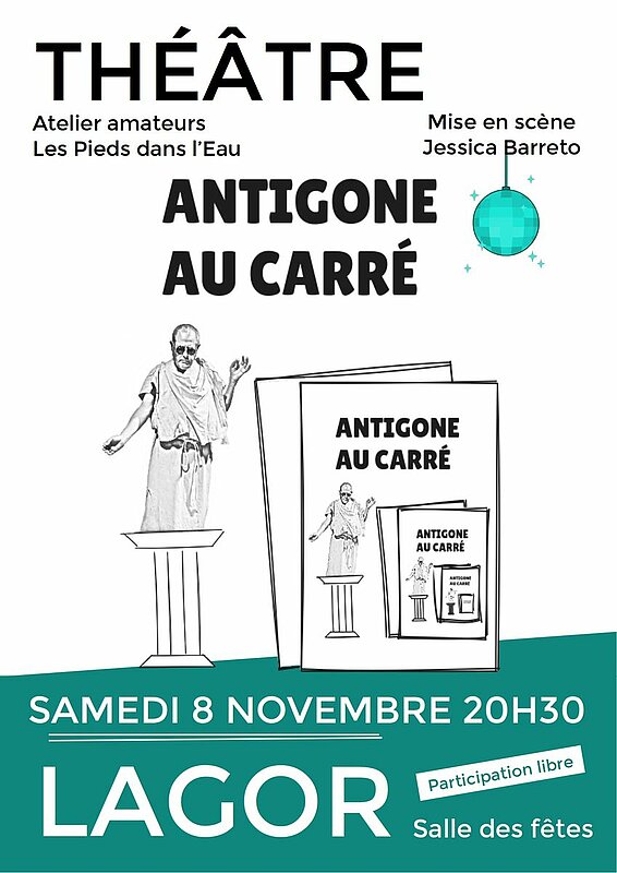 L’atelier amateurs de la compagnie théâtre Les Pieds dans l’Eau présente « Antigone au carré » mise en scène par Jessica Barreto samedi 8 novembre à 20 h 30 à la salle des fêtes de Lagor. Entrée en libre participation